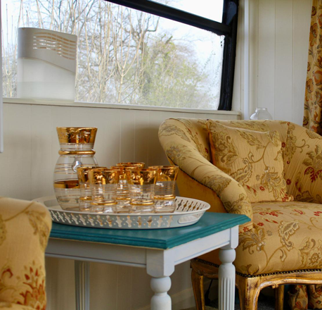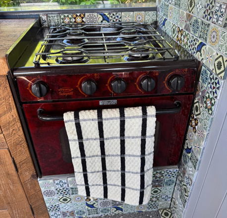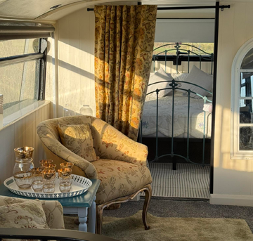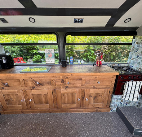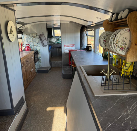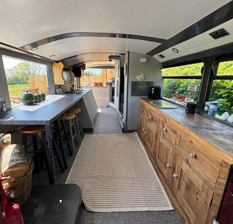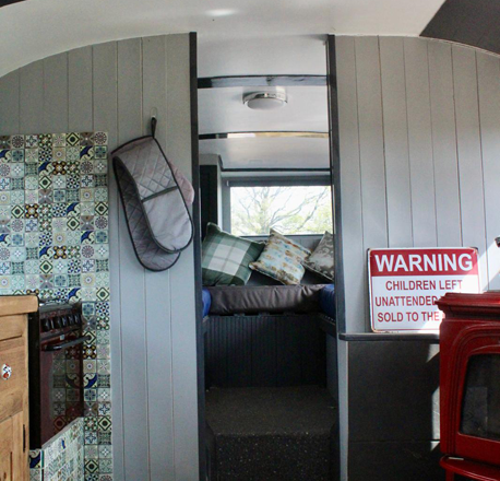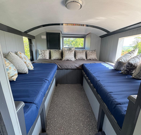 The door to the bus opens onto the kitchen area equipped with a vintage gas cooker and 4 gas hob, you will also find the up to date luxury of a coffee maker, microwave and air fryer. There is the wood burner for those slightly chillier days. The breakfast bar looks out the window directly at those views! At the back of the bus we have the Snug which can be used for chilling, reading or could be for extra sleeping area for children if you wish (sleeping Bags can be provided please ask at booking)